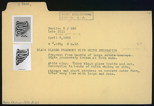 | Description: | Fragment from handle of large loutrophoros. Edges preserved; broken at both ends. Decoration in bands of thick white; on side, zigzags and short strokes; on concave outer face, broad wavy line with loops and dots. Attic clay. Thick black glaze inside and out. | |