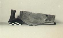 Description:   Vertical rim, flanged inside. Large rounded body, of which a few fragments remain; vertical spout on shoulder, not pierced through.