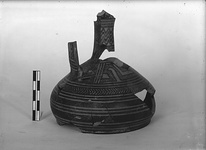 | Description: | Mended from many pieces; lip, top of handle and parts of body missing. Low ring base, unpainted; squat body; narrow neck; broad ribbon handle. Zigzags around neck and on handle; maeander on shoulder; below the maeander, which is interrupted by the handle, body decorated by narrow and broad stripes, and a chevron band. Pinkish-buff clay, grayed from burning. Brownish-black glaze. | |