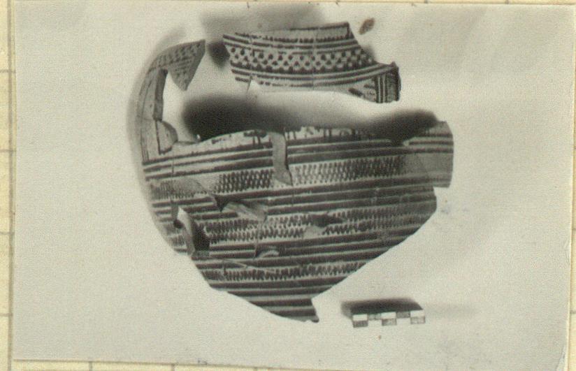 | Description: | Five fragments, much mended; none of neck or base preserved. Lower body, to shoulder, covered with triple bands interrupted by simple, double, and crossed zigzags. In panels on shoulder, front and back, processions of mourning women in long dresses, right? All but one broken off at bottom of skirt. Above, checkerboard pattern; chevrons in field between figures. Other fragments found later in tins join the pieces originally labelled a), b), and e) to each other, and give the curve of the body from just above the base to the shoulder; the whole strengthened with plaster. One small additional fragment does not join; this is fragment f). | |