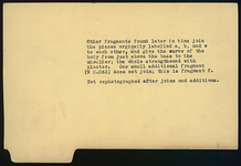 | Description: | Five fragments, much mended; none of neck or base preserved. Lower body, to shoulder, covered with triple bands interrupted by simple, double, and crossed zigzags. In panels on shoulder, front and back, processions of mourning women in long dresses, right? All but one broken off at bottom of skirt. Above, checkerboard pattern; chevrons in field between figures. Other fragments found later in tins join the pieces originally labelled a), b), and e) to each other, and give the curve of the body from just above the base to the shoulder; the whole strengthened with plaster. One small additional fragment does not join; this is fragment f). | |