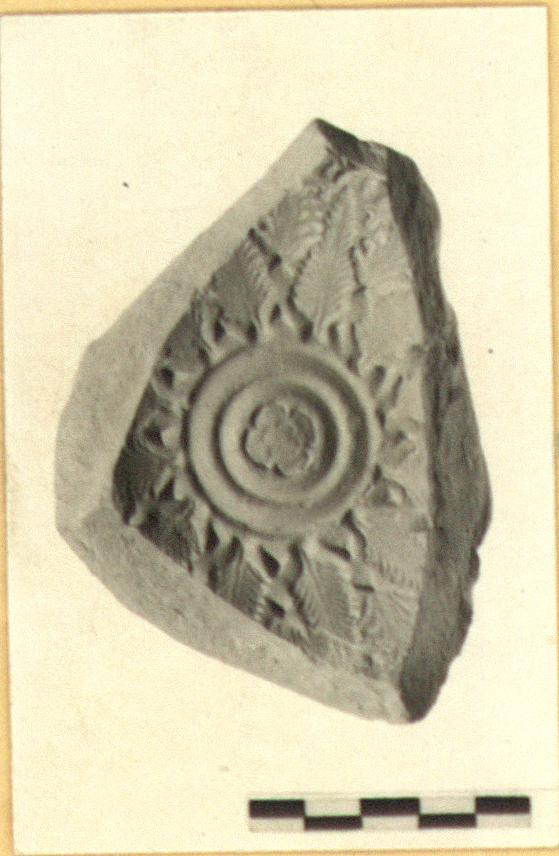 | Description: | The center has a four-petaled rosette surrounded with concentric ridges; from the outer ridge radiate small triangles; between them, and from their points extend palm branches and palmettes, alternating. Coarse pinkish red clay, unglazed. | |