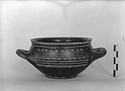 | Description: | Complete, save for slight chips from rim. Low cup; offset rim; horizontal handles. Quadruple zigzag panel on front and back; handles striped. Glazed all over, save underside of base and handles, parts reserved for pattern, stripes around lip and dot in center of inside. Pinkish-buff clay. Glossy brown glaze. | |