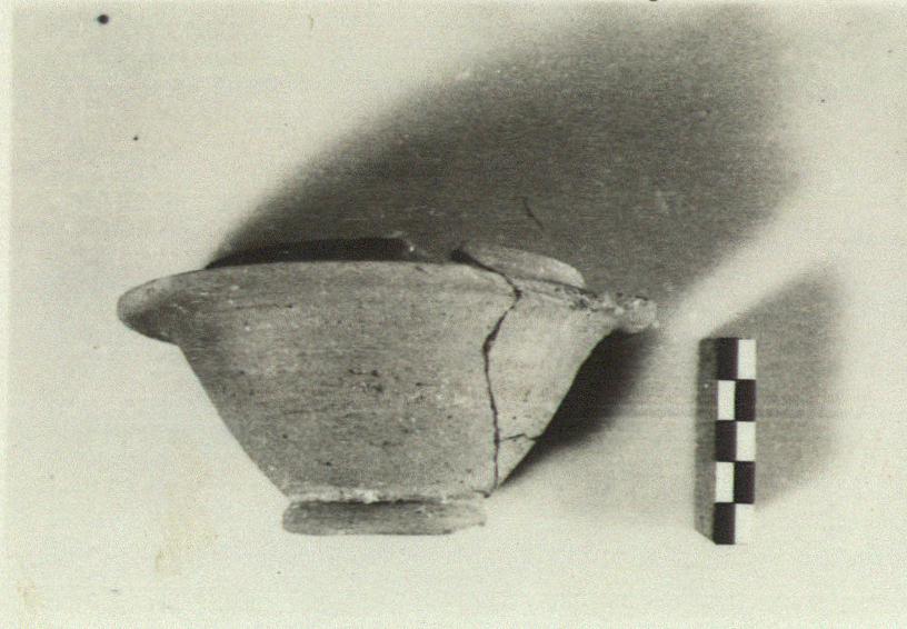| Description: | Small bowl on ring foot; wide flat flange projecting outward just below rim. Micaceous red clay, slipped. Unglazed. | |