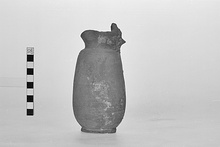 | Description: | Elongated trefoil-mouthed oinochoe on ring foot; vertical ring handle broken off at back of mouth. Two grooves around shoulder. Coarse gritty red clay; slipped. Unglazed. | |