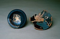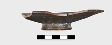 Description:   Shallow saucer on small ring foot; reserved groove around edge. More than half the rim and fragments from the floor missing. A griffin left, with one front paw raised, painted in thinned clay on the black ground, the details incised through to the black. Dot rosettes in added white in field.