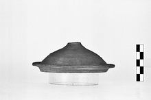 | Description: | Convex round lid with flat rim, flanged underneath. Knob handle broken off. Neatly made. Micaceous pinkish buff clay, slipped. Unglazed. | |