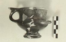 | Description: | Around the base and resting surface, incised ring filled with red. On floor, four stamped palmettes. Gray to pink clay; good black glaze. | |