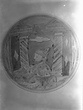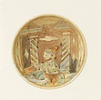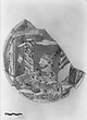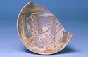 | Description: | Numerous fragments mended into one and preserving about three-quarters of the bowl. Profile complete. A shallow open bowl with plain rim and low ring foot. At center, a head with pointed cap and beard, between two spirally fluted columns. Above it, a cloud(?). In the background between the columns the clay is scraped away leaving an unslipped and unglazed surface. The outside, to within a couple of cm. of the foot, is covered with brown glaze, worn, over white slip. Pinkish-buff clay, white slip. Details of decoration added in brown, green and blue glaze. | |