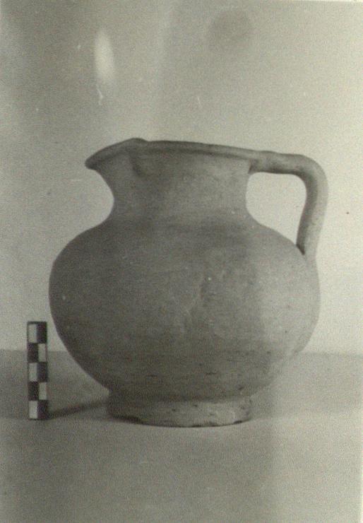 | Description: | Ring foot; rather squat round body; trefoil mouth with flat projecting lip. Gritty pink clay, slipped. Unglazed. | |