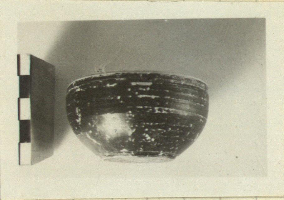 | Description: | Part of the rim missing. Flat bottomed small bowl. Grooves outside around bottom and lip. Gray to pinkish clay, black glaze. ADDENDA Perhaps a one-handled cup. | |