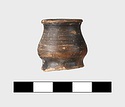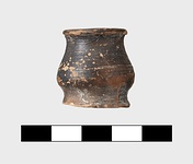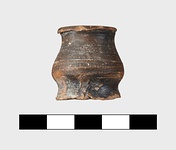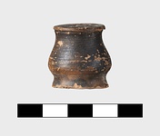 | Description: | Small handleless flat-bottomed stamnos; wheelmarks on bottom. Pinkish buff clay, thin black glaze. | |