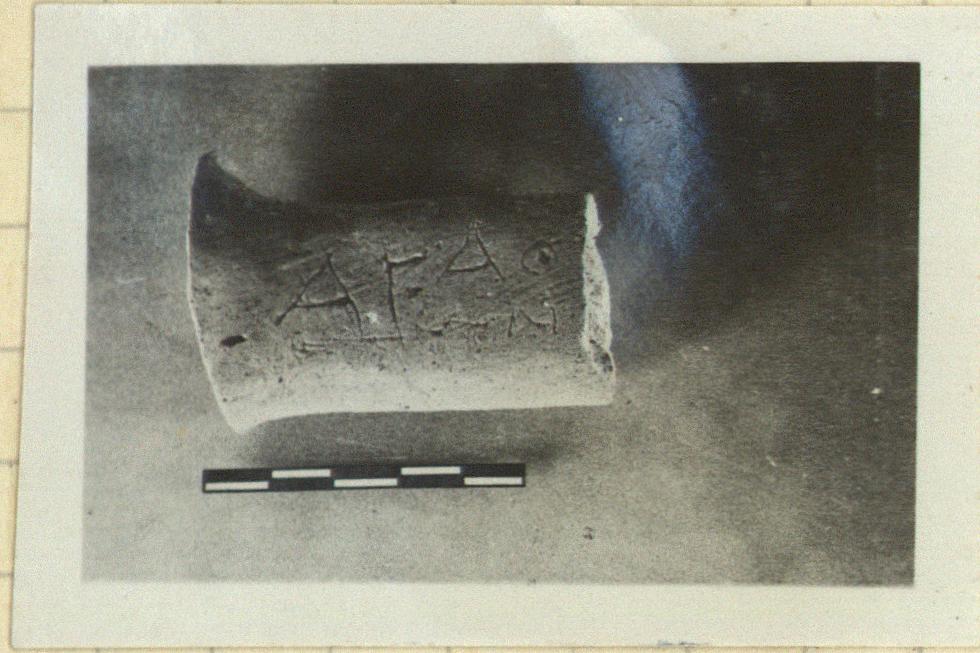 | Description: | Flat handle from an unglazed pot, amphora or pitcher. Incised on the outer face: Α Γ Α Θ Joined to P 5925. | |