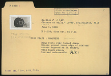 | Description: | Ring foot; rim turned down. Groove around inner edge of rim and around depression in center. Incised underneath: <graphic> Good black glaze. | |