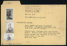 | Description: | Neck, handle and part of shoulder preserved. Restored in plaster. Fragments from base, with ring, may not belong. Rounded body, straight neck and grooved handle. Covered with pinky cream slip with shiny surface, not reaching to the foot except where it has run. Fine pink clay. | |