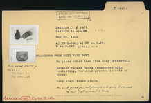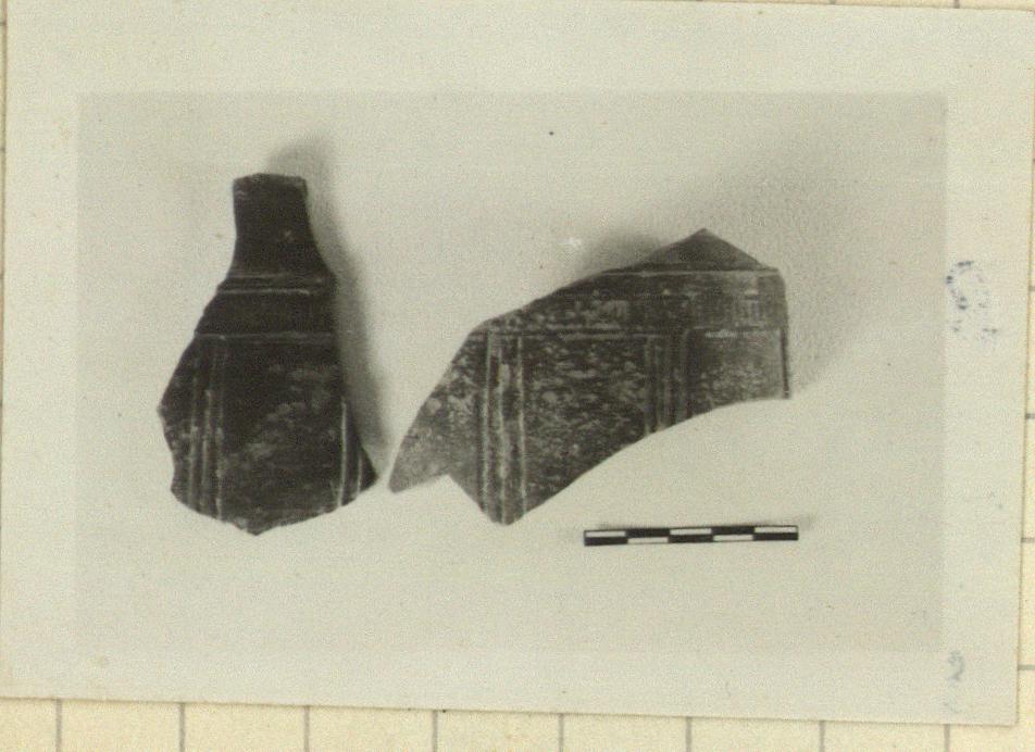| Description: | Only fragments from the body preserved. Fragment c) from lower wall to point of attachment of base. Restored in plaster. Between raised bands ornamented with rouletting, vertical grooves in sets of three. Gray clay; black glaze. | |