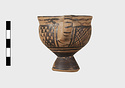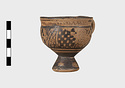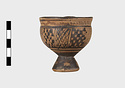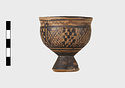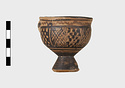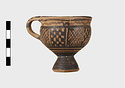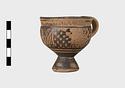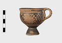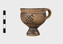 ADDENDA P 5869: Small cup with high flaring foot. Concave lip, slightly inset; vertical flat handle.