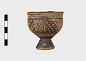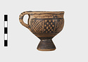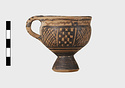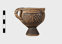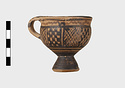 Description:   Intact. Shape as P 5869 (ΠΘ 125), but lower body; lip straight, not concave. Foot and interior glazed; body, lip and handle reserved. On body, above two stripes, eight rectangles alternately checked and crosshatched with a vertical stripe at each end of the series. On lip, horizontal zigzag between horizontal bands. Horizontal bands on handle.