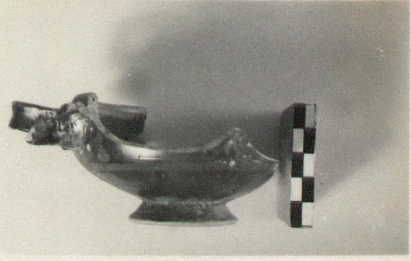 | Description: | One handle and much of one side missing. High foot, horned handles. Black glaze outside, red inside; purple bands on ledge for lid and around middle of side wall. | |