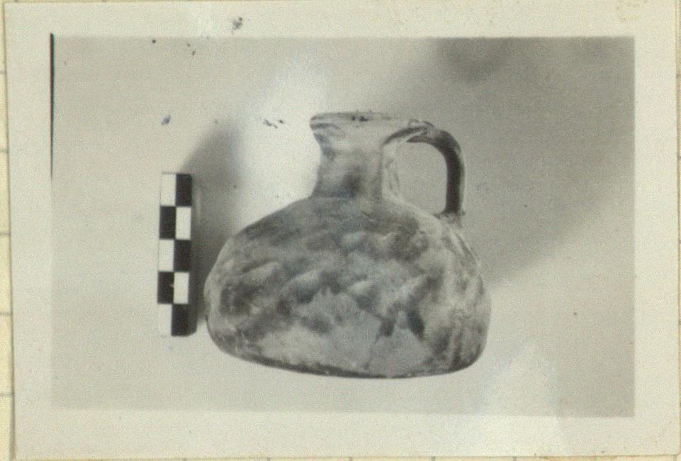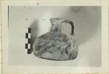 | Description: | Handmade. Flat-bottomed squat jug with narrow neck, flaring lip and one vertical double handle, shoulder to lip. Two rows of shallow depressions outside made by poking. Gray clay, mottled red to black glaze. | |