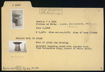 | Description: | Most of plain rim missing. Straight tapering stand with rounded foot. Fine teracotta clay, traces of whtie paint. | |