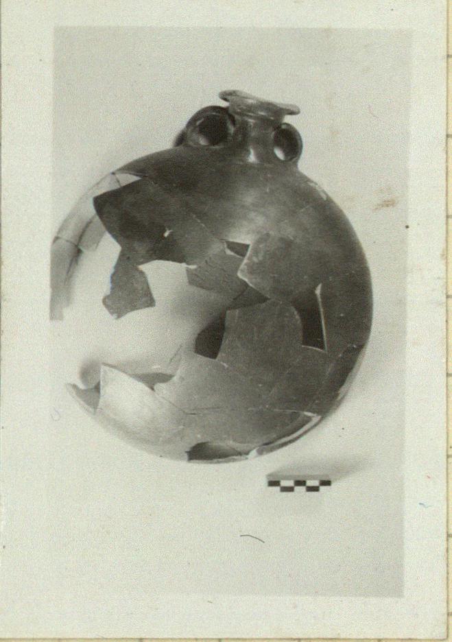 | Description: | Large round bottle flat on bottom and convex above, with horizontal mouth and two strap handles. Restored in plaster. Pinkish buff clay, black glaze. | |