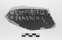 | Description: | From a large open bowl (possibly a semi-glazed krater?). Black glaze inside; none, except a band around the foot, outside. Incised inside: Θεμισθοκλες Φρεαρhιος | |
