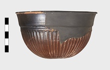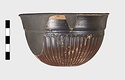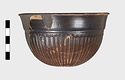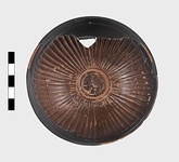 | Description: | Mended from many pieces; about two-thirds preserved. Central medallion: rosette. Sides fluted. Above fluting, broad shallow groove above which is an undecorated band, 0.018m. wide. Scraped grooves colored with miltos just below rim and around base medallion. Attic clay. Glaze blackest near rim outside; stacking(?) line (red) near bottom inside. Lower part fired chocolate brown. Cf. Agora XXII, nos. 327, 352. | |