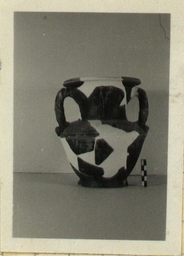 | Description: | Moulded ring foot; flaring lip; twisted handles. On shoulder front and back, between incised lines, incised cross-hatching and checkerboard pattern. On neck front and back, incised palmettes. Traces of white in palmettes and checkerboard. Restored in plaster. Dull black glaze. | |