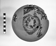 Description:   Similar to P 6006 (Γ 1607) but smaller. Restored in plaster. Inside ring foot, double cross of white and thinned clay paint; above foot, row of white dots between incised lines; on body, ivy pattern, stems and tendrils incised, leaves in thinned clay paint; berries and main stem in white; below rim between incised lines filled with red, thinned clay paint dots alternating with white double strokes.