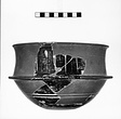 | Description: | Restored in plaster. Rounded bottom with imitation foot made by depressing a circular panel; two grooves around foot. Inside foot, double cross of white and thinned clay paint. On body above grooves, ivy pattern, leaves in thinned clay paint, stems and berries in white; two more grooves; pattern of horizontal white and vertical thinned clay paint strokes alternating. Keel between body and concave high rim; on rim, alternating white and thinned clay paint strokes; grooved below upper edge of out-turned rim. Glaze black to red, inside and out. | |