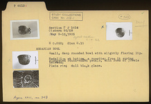 | Description: | Small, deep rounded bowl with slightly flaring lip. Medallion at bottom, a rosette; from it spring elongated round-ended petals, with rows of jewels between. Plain rim. Dull black glaze. | |