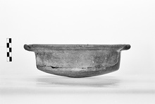 Description:   About half preserved. Straight side wall and gently rounded bottom; projecting rim, concave on upper surface; horizontal loop handles applied against wall.