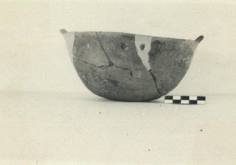 | Description: | Fragments missing from wall, restored in plaster. The vase had been broken in antiquity and mended with string(?) passed through holes drilled along side the fracture. Round bottom; gently out-turned lip. On one side a cleft lug rises from the rim. Coarse clay, fired ash gray. Slipped and polished both inside and out. Slip much flaked. Sub-Neolithic or Middle Helladic? | |