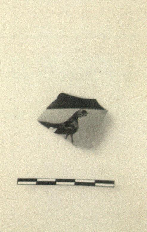 | Description: | Fragment from wall of band cup. In handle zone, a panther to right. Purple on his chest and ears, white spots on his neck. Inside solid black. | |