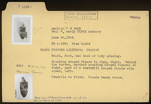 | Description: | Mouth, foot and back of body missing. Standing draped figure in biga, right. Behind the horses, another standing draped figure; at right, part of a seated(?) draped figure with spear, left. Tendrils in field. Purple bands below. | |
