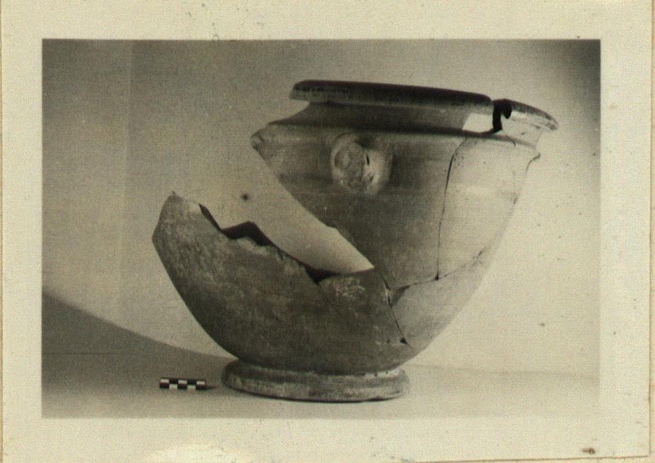 | Description: | Profile complete. Much missing. Large ring foot, swelling body with horizontal loop handles. Moulded ring above handle attachments; round outward-turned rim. Black glaze, much pitted inside; outside, on rim, band at handle zone, and on foot. Thin reddish glaze wash over the whole of the exterior. Five small holes neatly punched through the floor. Cf. P 6053 (Γ 1755), P 6126 (Γ 1821). | |