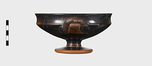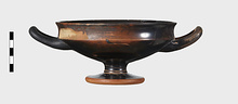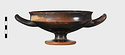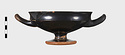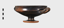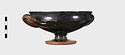 | Description: | One handle, a small rim fragment, and a bit of the floor missing. Incised lines around base of stem. Offset lip. Cf. P 6120ff; same shape. Pink to grayish clay; good black glaze, somewhat peeled. | |