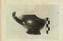 | Description: | About half preserved with most of one cup handle. High moulded ring foot. Body like a shallow bowl, but with straight rim set back; and sloping slightly inwards, probably meant to take a lid. Black glaze, all over, save for edge of rim, reserved. | |