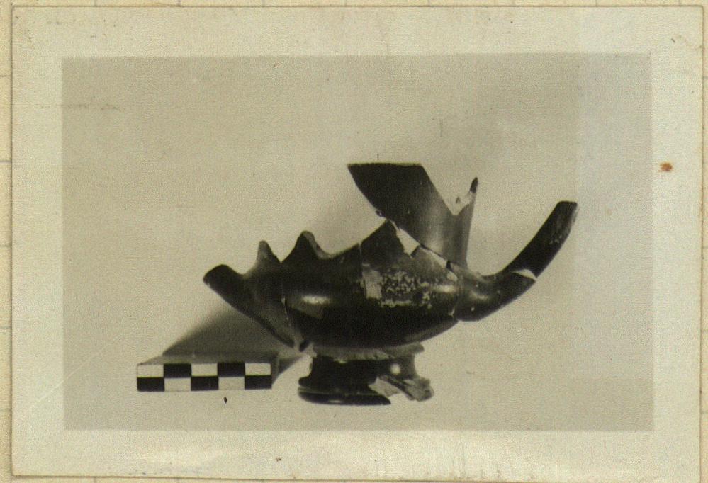 | Description: | Fragmentary but profile complete. Four stamped palmettes surrounded by dot and rouletting at center of floor. Moulded ring foot. Plain vertical rim. Good black glaze, all over save for a reserved groove beneath the foot. | |