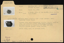 | References: | Publication: Agora XXIX Publication: Hesperia 3 (1934) Publication Page: Agora 29.1, s. 338, p. 299 Publication Page: Agora 29.1, s. 559, p. 520 Drawing: PD 2611-25 (DA 8470) Image: 2012.23.0095 (4-327) Object: Agora XXIX, no. 533 Deposit: H 16:4 Card: P 620 |