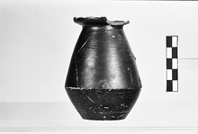 Description:   Mended from several fragments, but complete save for vertical handle broken away, and chips around rim. Small flat bottom; profiled body, greatest circumference below center; rim set back, rising at outer edge.