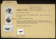 | Description: | Restored in plaster. Shallow shell-shaped dish with rounded bottom. Loop handle. The plain edge pinched together at back for pouring between the handle attachments. Metallic black glaze. | |