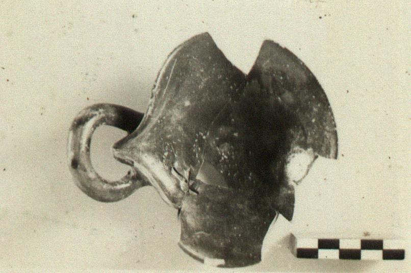 | Description: | Restored in plaster. Shallow shell-shaped dish with rounded bottom. Loop handle. The plain edge pinched together at back for pouring between the handle attachments. Metallic black glaze. | |