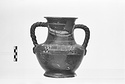 | Description: | Fragmentary. Restored in plaster. Ring foot, squattish body, concave high neck flaring at the lip. Twisted vertical handles with moulded masks at their bases. Incised ring above foot. On shoulder between incised grooves, diminishing rectangles and checkerboard pattern in terracotta paint and white; on neck, front and back, necklaces with pendents in terracotta paint and white. Rather metallic black glaze. | |