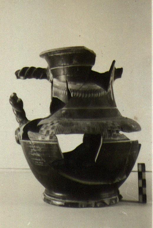 | Description: | Fragmentary. Restored in plaster. Ring foot, squattish body, concave high neck flaring at the lip. Twisted vertical handles with moulded masks at their bases. Incised ring above foot. On shoulder between incised grooves, diminishing rectangles and checkerboard pattern in terracotta paint and white; on neck, front and back, necklaces with pendents in terracotta paint and white. Rather metallic black glaze. | |