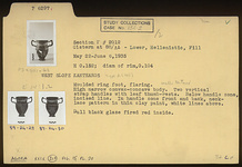 | Description: | Restored in plaster. Moulded ring foot, flaring. High narrow convex-concave body. Two vertical strap handles with leaf thumb-rests. Below handle zone, incised line. In handle zone front and back, necklace pattern in thin clay paint, white lines above. Dull black glaze fired red inside. | |