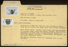 Description:   Similar to P 6302 but smaller. One continuous curve from top to bottom but upper wall very nearly straight. Leaf thumb-rests. Handle zones front and back defined by incised lines above and below; between, diminishing rectangles on each side of checkerboard pattern in thin clay paint; centers of diminishing rectangles and alternate checkers, white.