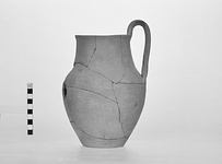 | Description: | Flat-bottomed with convex-concave profile, wide mouth and plain round lip. One vertical strap handle, looped high from rim to shoulder. Pinkish buff clay. | |