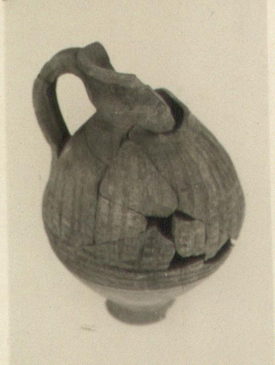 | Description: | Mended from several fragments; about half of neck missing. Small jug; oval body tapering to small foot and neck; triple-ridged handle from slightly flaring neck to shoulder. Upper part of body heavily grooved horizontally and diagonally. Scratched on neck, next to break: <graphic> Buff to pinkish-gray clay. Upper part of body and inside of the neck just below the rim covered with thin purplish wash, sparingly applied. | |